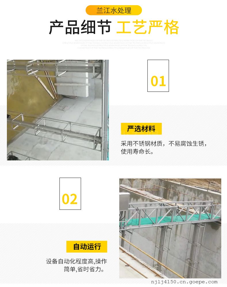 5、桁车式刮泥机可采用PLC控制,根据需要设备吸泥机的全程、半程运行方式。可用时间控制吸泥机的周期,也可附泥拉计检测池底积泥情况自动运行。