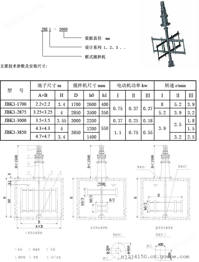 框式搅拌机由电机、减速机、机架、搅拌轴、桨板、联轴器、水下支座等组成。