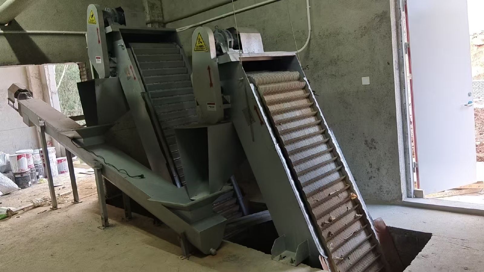 耙齿链运转到设备的上部时,由于槽轮和弯轨的导向,使每组耙齿之间产生相对自清运动,绝大部分固体物质靠重力落下。另一部分则依靠清扫器的反向运动把粘在耙齿上的杂物清扫干净。