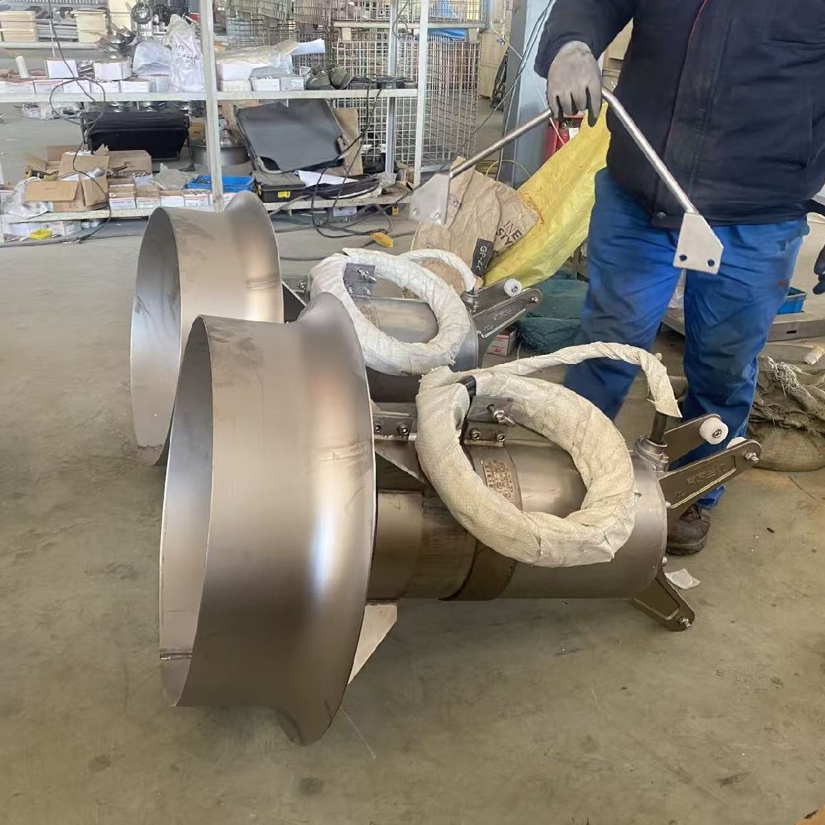 ●潜水搅拌机的电机绕组为F级绝缘,防护等级为IP68。在污水厂的曝气系统中配合使用,可使系统能耗大大降低,且充氧量明显提高,能有效的防止沉淀。根据工艺要求,直联式潜水搅拌可配用导流罩。